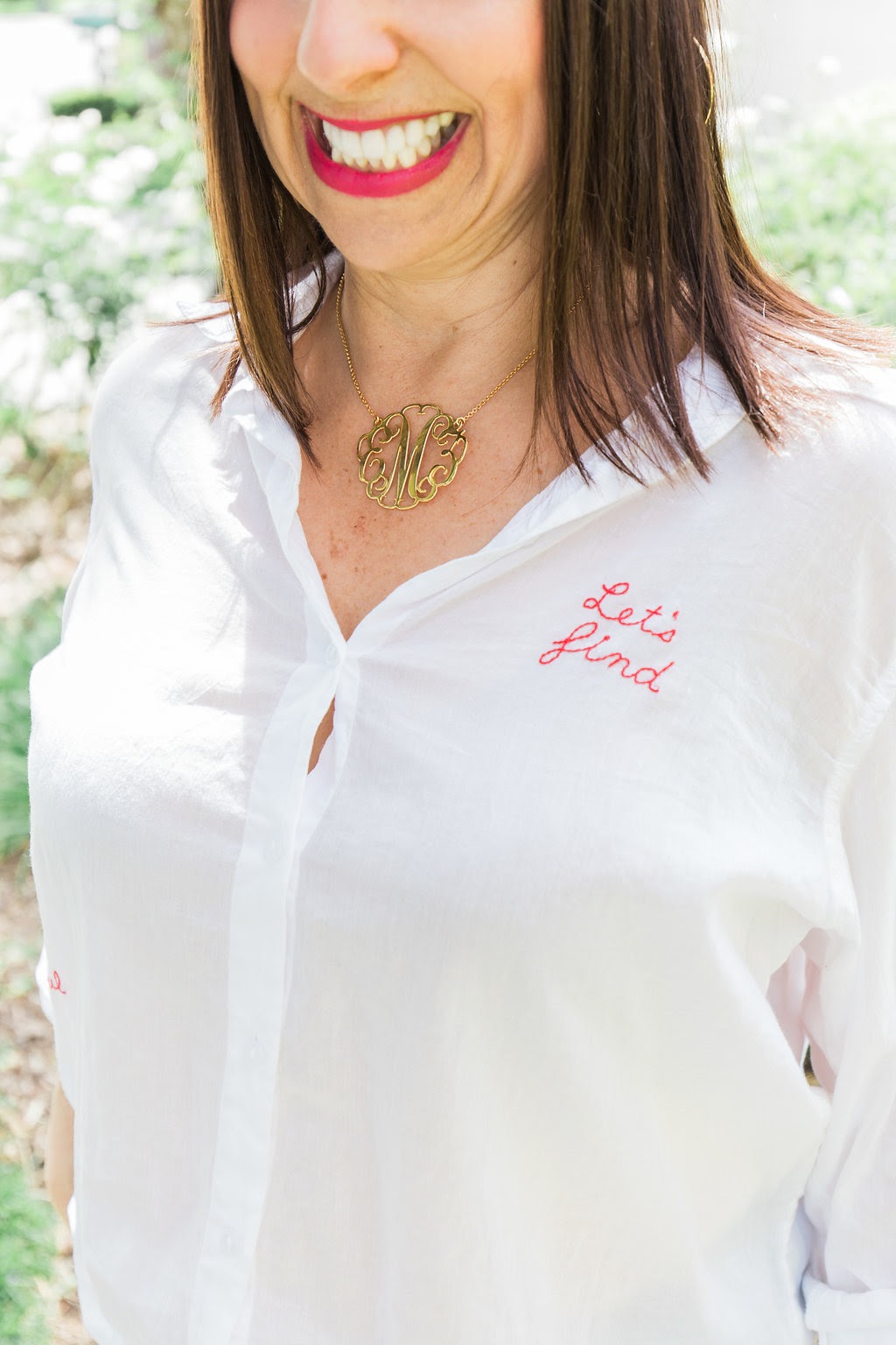 Embroidered shirts are so on trend!! And these cute words embroidered on this shirt just make me so happy. To complete this outfit, I added a great pair of boyfriend jeans, some fun fur mules and this adorable monogramed necklace from Julia Marie. I am obsessed with this necklace and have been wearing it on repeat.